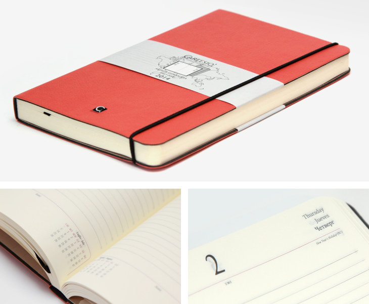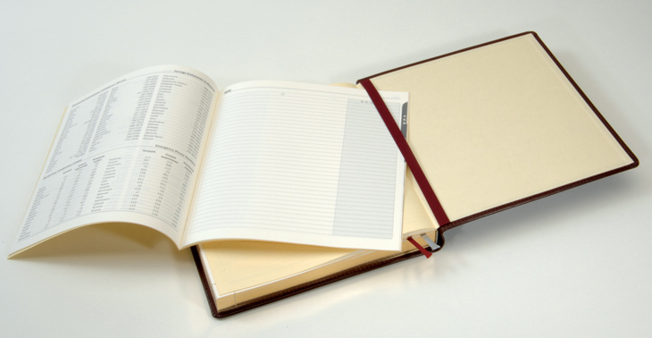 Интересные особенности: формат 21 х 26 см, бумага «слоновая кость», отрывные уголки, две закладки, инфоблок, алфавитная вкладка, даты без привязки к дню недели и году, большой, классический, элегантный.