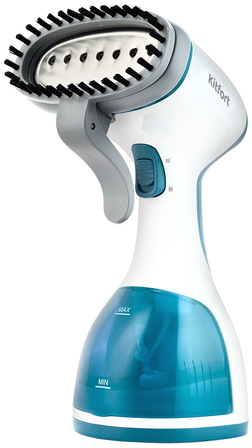 KITFORT KT-916 получил довольно компактный и нетяжелый (1 кг) корпус. К тому же для равномерного распределения веса резервуар для воды расположен в нижней части рукоятки. Полупрозрачная съемная емкость вмещает 260 мл и предусматривает отметки минимального и максимального уровня, поэтому процесс наполнения и контроля количества жидкости в баке очень прост. Органы управления дополнены ползунковым фиксатором, который служит для постоянной подачи пара или блокировки прибора от детей.