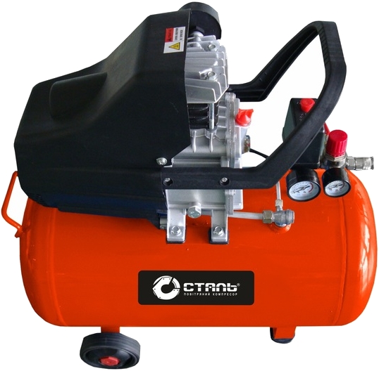 Невзирая на знакомое нашим ушам название марки «Сталь», компрессор с индексом модели KST-24 имеет китайскую «породу» и, откровенно говоря, качеством сборки не блещет. Зато он является одним из самых доступных входных билетов на арену оборудования для подачи сжатого воздуха.