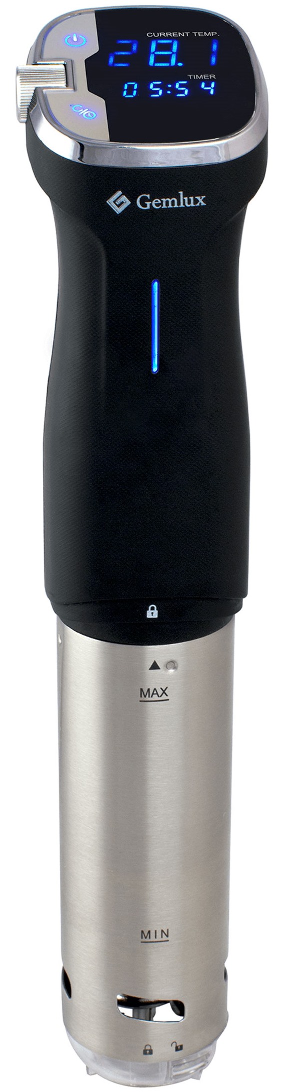 Если внимательно посмотреть на су-вид аппарат Gemlux GL-SV800BLR серии Premium, то сразу видно, что его дизайн «слизан» с модели Steba SV 50 и устройство отличается лишь тем, что немного крупнее габаритами. Но при размерах 44x13x11 см и схожем техническом оснащении данный китайский прибор стоит почти вдвое дешевле. Это обстоятельство при выборе может склонить чашу весов в пользу более доступной модели. Типичная конструкция представляет собой металлический кожух с характерными метками уровня воды «Min» и «Max» на наружной поверхности, а его нижняя часть закрыта прозрачным пластиковым колпаком, через который просматривается крыльчатка винта насоса. Четыре удлиненных отверстия внизу открывают непосредственный контакт с нагревательным элементом. Кожух соединяется с ручкой с помощью байонетного крепления и легко снимается для очистки нагревателя. Боковая прищепка и покрытие рукоятки выполнены из приятного на ощупь матового прорезиненного пластика, а на боковой поверхности ручки видна полоса светодиодного индикатора питания.