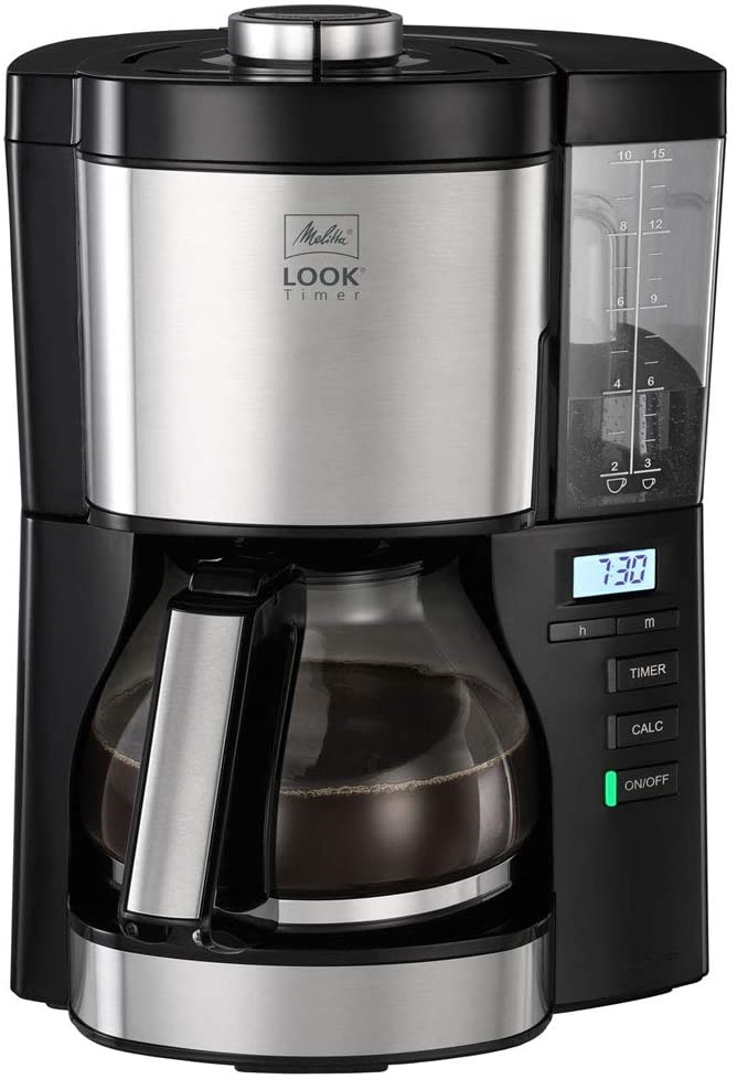 Фильтрационная кофеварка Melitta Look V Timer родом из Германии, где знают толк в приготовлении вкусного кофе. Модель сразу обращает на себя внимание нестандартной компоновкой узлов, обеспечивающей удобство использования аппарата, и продвинутыми технологическими решениями. У прибора современный дизайн с множеством элементов из нержавеющей стали. Для того чтобы загрузить молотый кофейный порошок, следует открыть поворотный отсек с держателем фильтра и съемным вкладышем фильтра очистки воды. Капельная система оснащена клапаном предотвращения протечек Drip-Stop. Прозрачный резервуар для воды объемом 1.25 л расположен не как обычно внутри корпуса, а на виду с правой стороны. Бачок снабдили крышкой и ручкой: он легко снимается из установочного гнезда для наполнения водой, а с лицевой стороны на нем есть разметка мерной шкалы. Стеклянный кувшин, вмещающий 10 больших чашек напитка, получил ручку в виде солидной скобы и открывающуюся кнопкой крышку, а также съемный фильтрующий элемент.