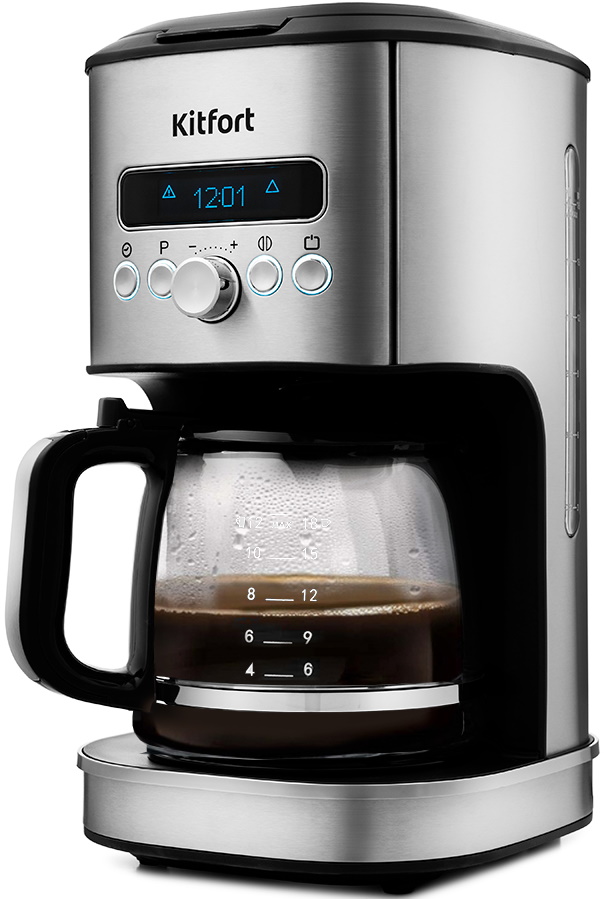 Фильтрационная кофеварка KITFORT KT-767 цвета нержавеющей стали станет отличным украшением кухонного интерьера и надежным помощником в приготовлении ароматного американо из молотого кофе. Данная модель сделана с упором на практичность и не может похвастаться изысканным дизайном. Увеличенные габариты аппарата 21x37x25 см объясняются солидной емкостью резервуара для воды 1.8 л и таким же вместительным стеклянным кувшином. Имейте в виду, что автоматическая защита от включения с пустым баком не даст прибору работать с незаполненным резервуаром. Под крышкой корпуса находится воронка, в которую устанавливается многоразовый фильтр со стальной сеткой. В нижнюю часть конуса встроен противокапельный клапан, закрывающий подачу, когда кувшин снимается с подставки. Платформа с подогревом сохраняет кофе горячим в течение 30 мин, после чего прибор автоматически отключается.