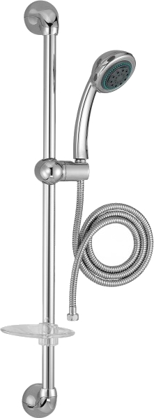 Основные элементы гарнитура изготовлены из алюминиевого сплава и дополнены деталями из ABS-пластика. За использование силумина в качестве основного конструкционного материала ставим минус производителю. Сплав характеризуется небольшим весом (масса комплекта всего 0.7 кг), но меньшей прочностью и долговечностью, чем общепринятая в сантехнике латунь. Металлические поверхности имеют хромовое покрытие, а пластиковые детали (кроме втулок) окрашены эмалью цвета хрома. Крепление душевой лейки, смонтированное на штанге длиной 600 мм, можно перемещать по высоте, подстраивая струи под рост пользователя. Лейка позволяет изменять интенсивность приема душа благодаря 5-ступенчатой настройке струи (поворотный регулятор). К нижней части стойки прикреплена мыльница, а верхний торец штанги венчает декоративный элемент со скошенным срезом.