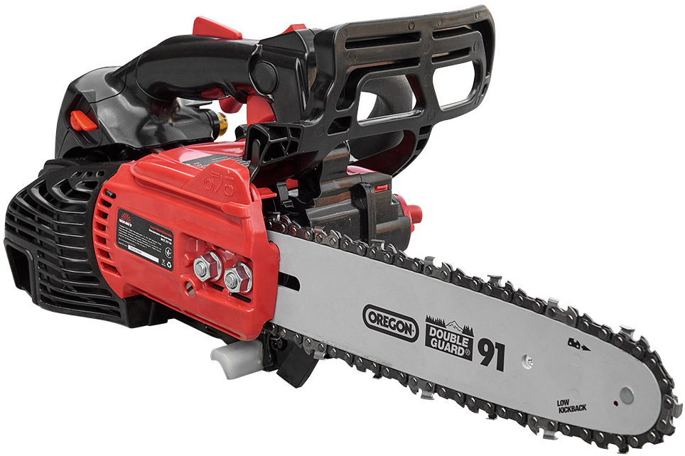 Данная бензопила отличается по-настоящему небольшим весом (всего 3 кг без учета веса топливной смеси и специального масла для смазки режущего оборудования), а также очень компактной конструкцией благодаря верхнему расположению основной рукоятки. За счет малого веса и скромных размеров инструмент особенно хорошо подходит для работы над головой или пиления веток в густых кронах деревьев. Шина имеет типоразмер 250 мм (10 дюймов). По ней со скоростью до 22 м/с движется 40-звенная цепь с шагом 3/8" между зубцами. За подачу масла на цепь во время пиления отвечает насос, работающий в полностью автоматическом режиме.