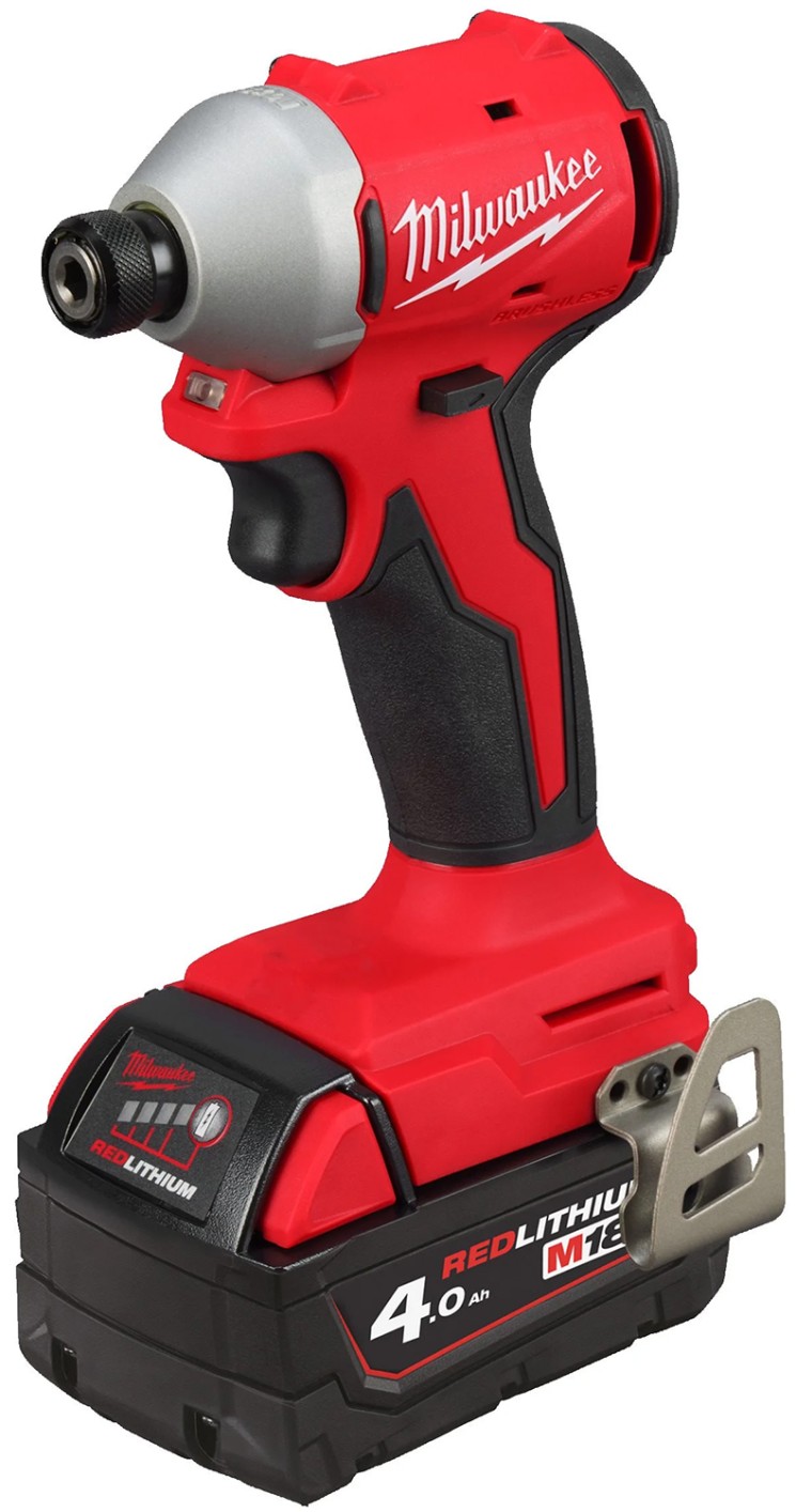 Шуруповерт оснащен бесщеточным мотором. Такие электродвигатели, как известно, отличаются повышенной мощностью и более экономным расходованием энергии, что очень важно при использовании аккумуляторных инструментов. При этом бесщеточные моторы имеют меньшие размеры. Благодаря этому фактору производителю удалось «упаковать» инструмент в весьма компактный корпус. Головка инструмента имеет всего 112 мм в длину, что позволяет работать в ограниченных и тесных пространствах. Освещение рабочей зоны обеспечивается светодиодом, встроенным под патроном. На корпусе есть металлическая клипса, позволяющая повесить инструмент на ремень, когда требуется освободить руки. Шестигранные насадки фиксируются в патроне с помощью рифленого оттягивающегося кольца, что дает возможность быстро и легко менять биты одной рукой. В качестве источников питания, необходимых для работы аккумуляторного шуруповерта Milwaukee M18 BLIDRC-402C, используются литий-ионные батареи из семейства Milwaukee M18. В комплекте есть два аккумулятора, каждый из которых имеет емкость 4 Ач, зарядное устройство и пластиковый кейс.