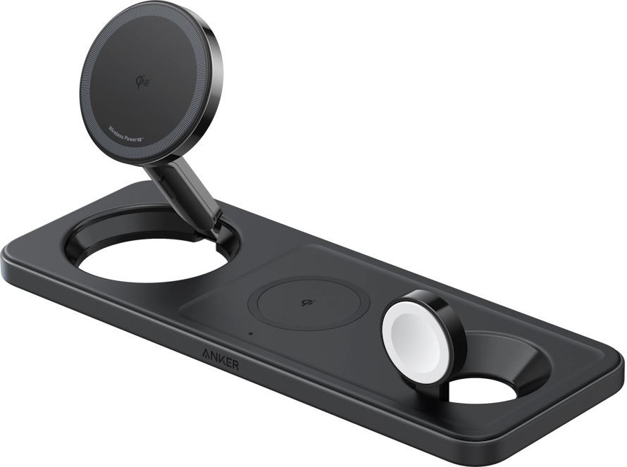 ANKER MagGo Wireless Charging Station 3-in-1 Pad оснащен фирменным магнитом, который является аналогом MagSafe и обеспечивает стабильную фиксацию телефона. К тому же у держателя гибко регулируется наклон, что позволяет задать для него удобное положение для разных задач, будь то видеоконференция или скроллинг ленты новостей.