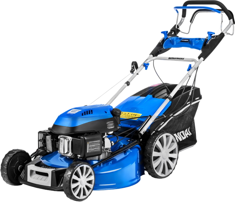 На данной косилке установлен хороший, проверенный временем 4-тактный бензиновый двигатель Hyundai ICV200 с рабочим объемом 196 см³. Он имеет достаточно мощности (5.6 л.с.), чтобы косить густую и сочную траву и одновременно перемещать 40-килограммовый аппарат по газону. По обе стороны от центральной панели с двумя подстаканниками находятся рукоятки для управления двигателем и вариатором. Одна из них позволяет управлять положением воздушной заслонки в карбюраторе (необходимо для легкого запуска ДВС), а вторая дает возможность изменять скорость движения самоходной косилки. Высоту основной рукоятки газонокосилки при сборе можно отрегулировать под себя. А при транспортировке или хранении она может складываться, уменьшая высоту аппарата вдвое. Производитель также позаботился об удобном обслуживании машины: в стальном корпусе есть специальный штуцер. После завершения стрижки газона к нему можно подключить шланг с водой, чтобы быстро промыть нож и внутреннюю часть деки от остатков скошенной растительности.