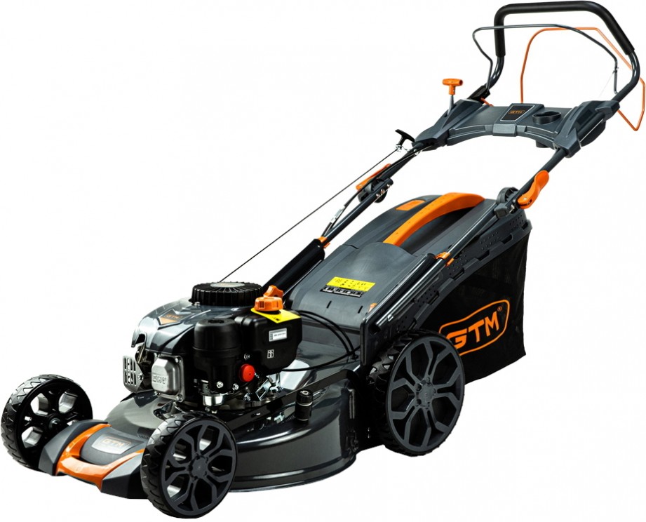 За передвижение аппарата и привод режущей системы отвечает силовая установка — 4-тактный бензиновый двигатель. Он имеет мощность 5.5 л.с. при рабочем объеме 171 см³. Двигатель запускается с помощью вытяжного тросика (в продаже также есть чуть более дорогая версия GTM LM53E-SP-V с электростартером, позволяющим запускать ДВС простым нажатием на кнопку). Мотор работает на обычном бензине А-92, который заправляется в бензобак объемом 0.6 л (столь небольшой объем топливного бака — едва ли не единственный недостаток, обнаруженный нами). Роторная режущая система имеет ширину захвата 53 см. Синхронный механизм подъема и опускания корпуса позволяет одним движением рычага настроить высоту кошения травы в диапазоне от 30 мм до 80 мм (6 ступеней). Растительность, срезанная ножом, собирается в 70-литровый контейнер. Но в комплекте также есть заглушка для мульчирования травы и дефлектор, позволяющий выбрасывать скошенную зеленую массу в сторону.