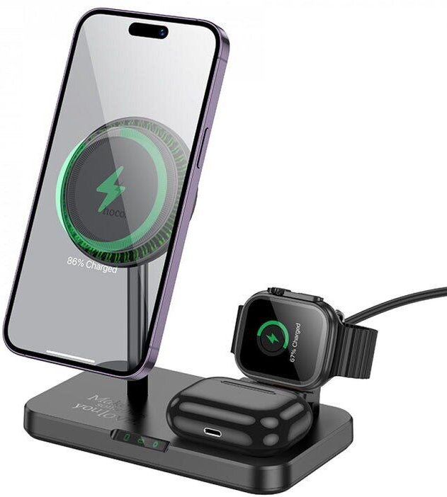 Дебютант 2025 года в линейке торговой марки Hoco — это недорогая беспроводная док-станция с тремя рабочими площадками и поддержкой технологии Qi 2.0. Последний момент означает наличие магнитов, обеспечивающих стабильность смартфона, и выходную мощность до 15 Вт, которая способствует достаточно быстрому процессу питания «по воздуху». Помимо мобильного телефона аксессуар подходит для Apple Watch и TWS-наушников с поддержкой беспроводной зарядки.