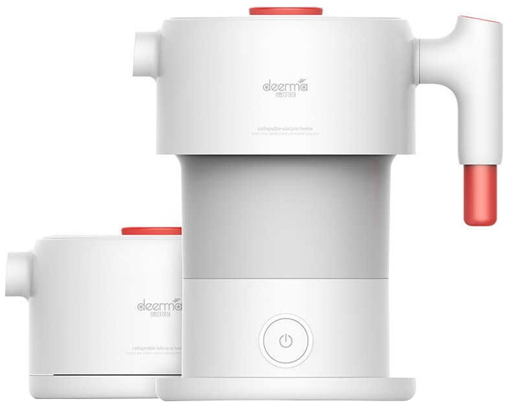 Главная фишка электрочайника бренда Deerma — это сочетание возможностей дорожной и складной модели. Корпус состоит из жесткой пластиковой основы и гибкой центральной части. Последняя сделана из пищевого силикона и складывается гармошкой. Соответственно, если в рабочем состоянии высота приближается к 20 см (19.4 см), то в сложенном виде составляет всего 9.4 см.