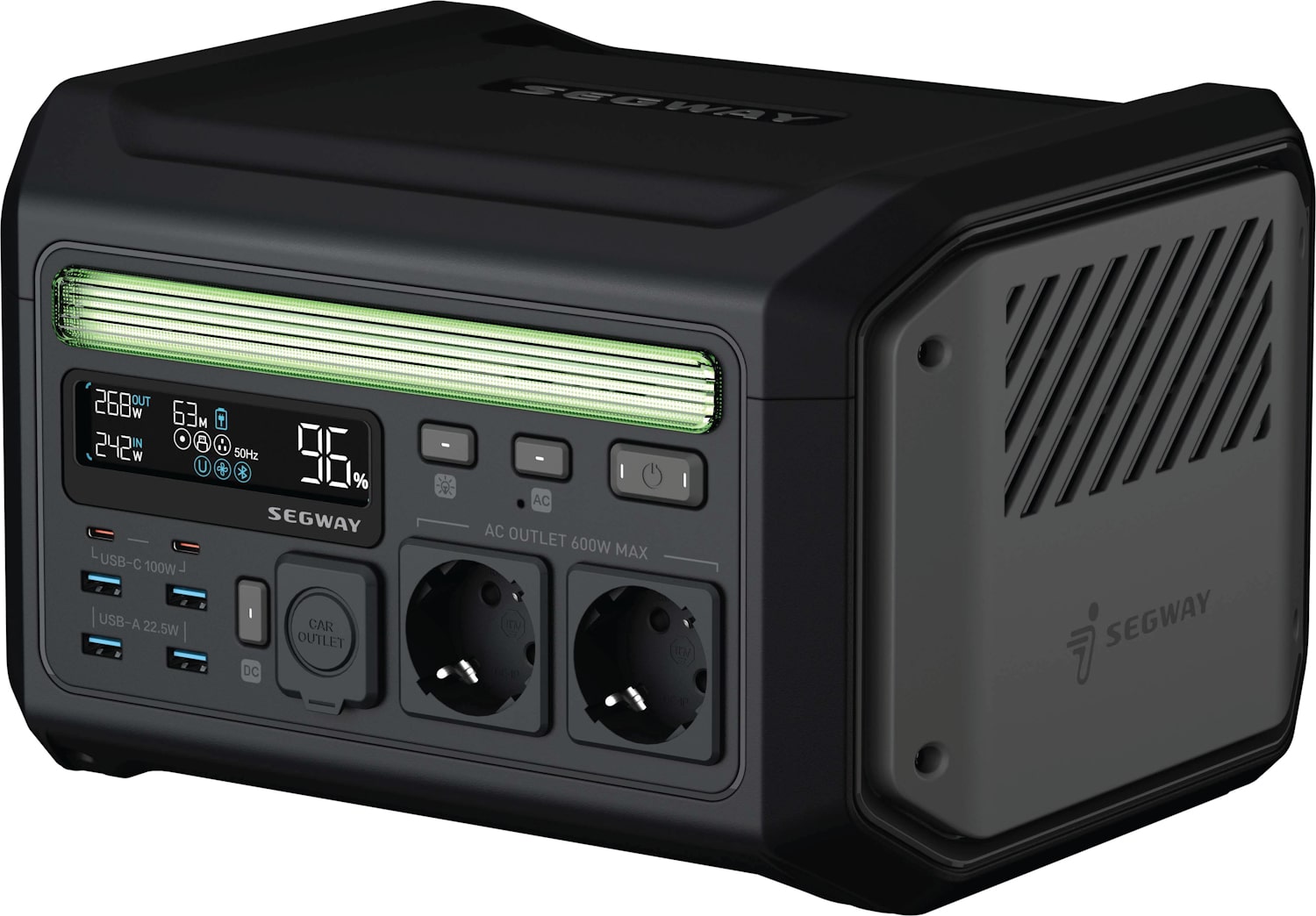 Порты подключения выведены на переднюю панель корпуса зарядной станции. В их числе пребывают два розеточных гнезда на 230 В, пара USB type C с поддержкой быстрой зарядки по протоколу Power Delivery (мощностью до 100 Вт), четыре порта USB A, выход автоприкуривателя. Тут же находится инфо-дисплей, альтернативой которому послужит удаленное управление со смартфона через мобильное приложение Segway-Ninebot.