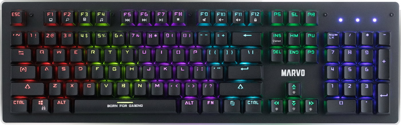 Клавиатура Marvo KG909 обладает четким тактильно-звуковым откликом за счет применения синих переключателей типа Clicky от компании Outemu. При доступной стоимости компания гарантирует рабочий цикл около 50 миллионов нажатий и эффективные технологии, которые избавят от случайных и ложных срабатываний во время гейминга и работы. Однако стоит учитывать высокую шумность модели, что может создать дискомфорт окружающим. Кейборд разработан с акцентом на геймеров, которые хотят ощущать динамику управления, повысить эффективность ведения боя и при этом сохранить свой бюджет. Качественная сборка включает усиленную металлическую пластину для противодействия деформациям во время активных нажатий, надежный кабель в оплетке и кейкапы с технологией нанесения символов Double Shot, что гарантирует иммунитет к истиранию.