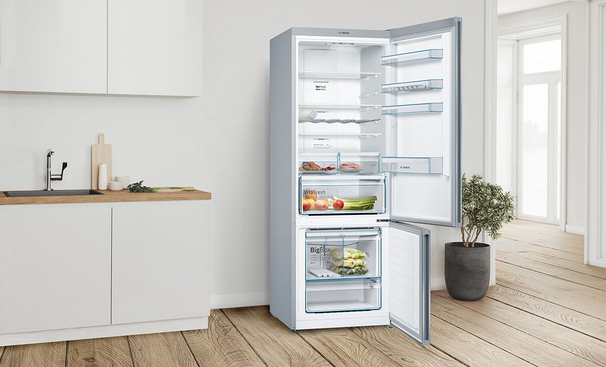 Будучи всего лишь на 10 см шире привычных двухкамерных визави, холодильник Bosch KGN492LDF обладает 75 л дополнительного объема. В его «нутре» можно хранить много продуктов в одночасье.