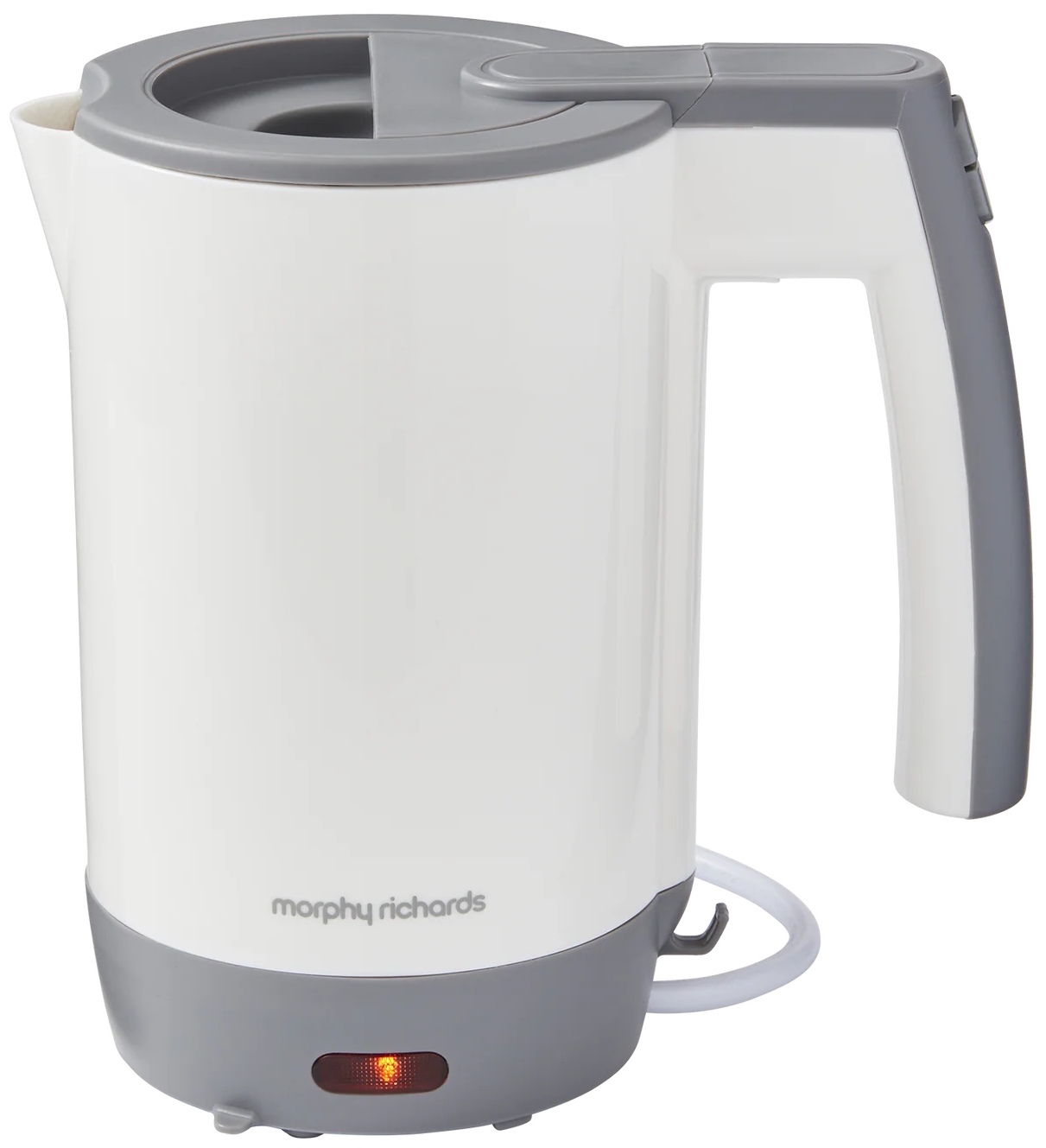 Электрочайник емкостью 500 мл от торговой марки Morphy Richards относится к дорожным моделям. Для распития горячих напитков в пути в комплектацию с ним включены 2 пластиковые чайные чашки. А чтобы 0.7-метровый кабель не мешал при транспортировке в нижней части корпуса есть специальный крючок-держатель: можно смотать провод вокруг колбы, чтобы он не мешал.