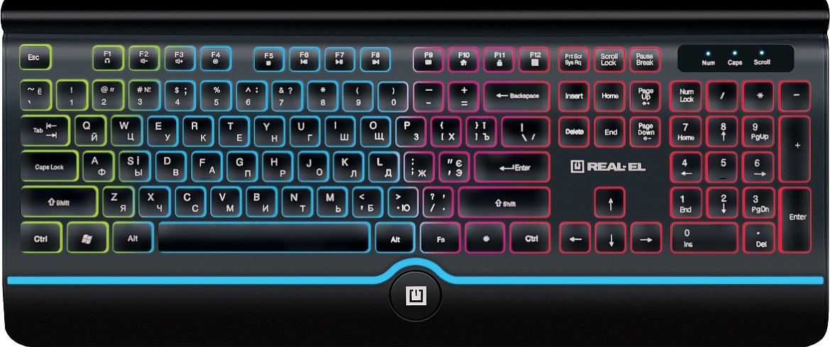 Клавиатура REAL-EL Comfort 8000 Backlit предлагает нестандартную закругленную верхнюю часть корпуса и небольшую подставку в зоне размещения рук для удобства набора текста. Такая необычная компоновка дополняется яркими акцентными вставками и многоцветной подсветкой, разделенной на четыре зоны. Производитель также предусмотрел один режим динамической визуализации, изменение яркости. Стоит отметить продуманную конструкцию кейкапов с прозрачными боковыми гранями для всестороннего распределения освещения. Манипулятор подарит положительный настрой как в условиях офиса, так и в домашней обстановке, не требует настройки и легко подключается через стандартный порт USB-A к любым устройствам под управлением Windows.