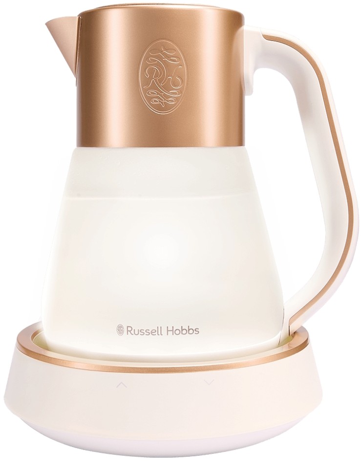 Модель бренда Russell Hobbs сразу обращает внимание благодаря своей внешности. Корпус отличают вставки медного цвета и колба из матового стекла, которая оригинально смотрится на фоне полностью прозрачных аналогов (но все равно обеспечивает визуальный контроль уровня воды).