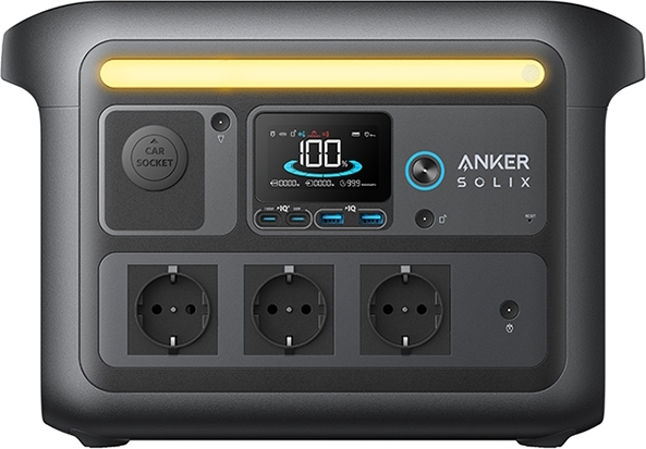 Из подключений на борту ANKER SOLIX C800X имеются трио стандартных розеток на 230 В, два USB A, пара USB type C (30 + 100 Вт), выход автоприкуривателя, входной разъем XT60 (для зарядки от солнечных панелей). Для удаленного управления параметрами станции служат беспроводные коммуникации Wi-Fi и Bluetooth. Наконец, модель подкупает быстрой зарядкой собственной АКБ — от розетки она полностью напитывается энергией всего-навсего за 58 мин.