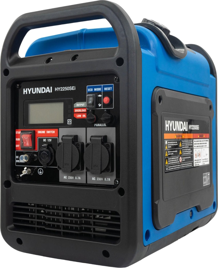Генератор Hyundai HY2250SEi обеспечивает повышенный комфорт эксплуатации благодаря продуманному техническому оснащению. Модель выгодно выделяется на фоне конкурентов наличием электростартера, что облегчает ежедневный запуск в условиях частого отключения электроэнергии. Компании удалось добиться умеренного шума (61 дБ на расстоянии 7 м), который не создаст дискомфорт во время пикника, туристических походов или при размещения вблизи жилой зоны. Еще одной положительной чертой является повышенная автономность (около 8 часов при нагрузке 50%) за счет экономичного расхода и увеличенного до 6 литров бака, что сокращает периодичность обслуживания. В режиме Эко достигает максимальный показатель экономии и минимальный уровень шума. На дисплее отображается расширенный перечень данных о работе устройства — моточасы, обороты, напряжение, частота тока, запас топлива, уровень загрузки, индикация перегрузки, низкого уровня масла и заряда аккумулятора. Таким образом, регулярная эксплуатация требует минимум усилий и времени от пользователя.