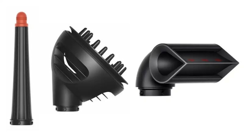 Насадки. Еще одной главной особенностью продукции Dyson являются необычные насадки, которые надежно крепятся с помощью магнитов и поворачиваются в любую необходимую сторону. Базовая комплектация фенов Supersonic обычно включает в себя несколько насадок: концентратор для создания направленного потока воздуха, диффузор для вьющихся и волнистых волос, насадку Gentle Air в форме некой звезды, рассеивающей воздух через широкие отверстия, для чувствительной кожи головы и тонких волос, насадку-гребень и специальную насадку для устранения пушистости волос. В дальнейших комплектациях появилась насадка Flyaway, ставшая одной из самых интересных разработок компании: она использует аэродинамический эффект Коанда, при котором поток воздуха притягивает мелкие выбившиеся волоски к основной массе и приглаживает их, создавая визуально более ровную и блестящую поверхность. А ее усовершенствованная версия Flyaway Smoother работает в двух режимах: с щетинками и без них.