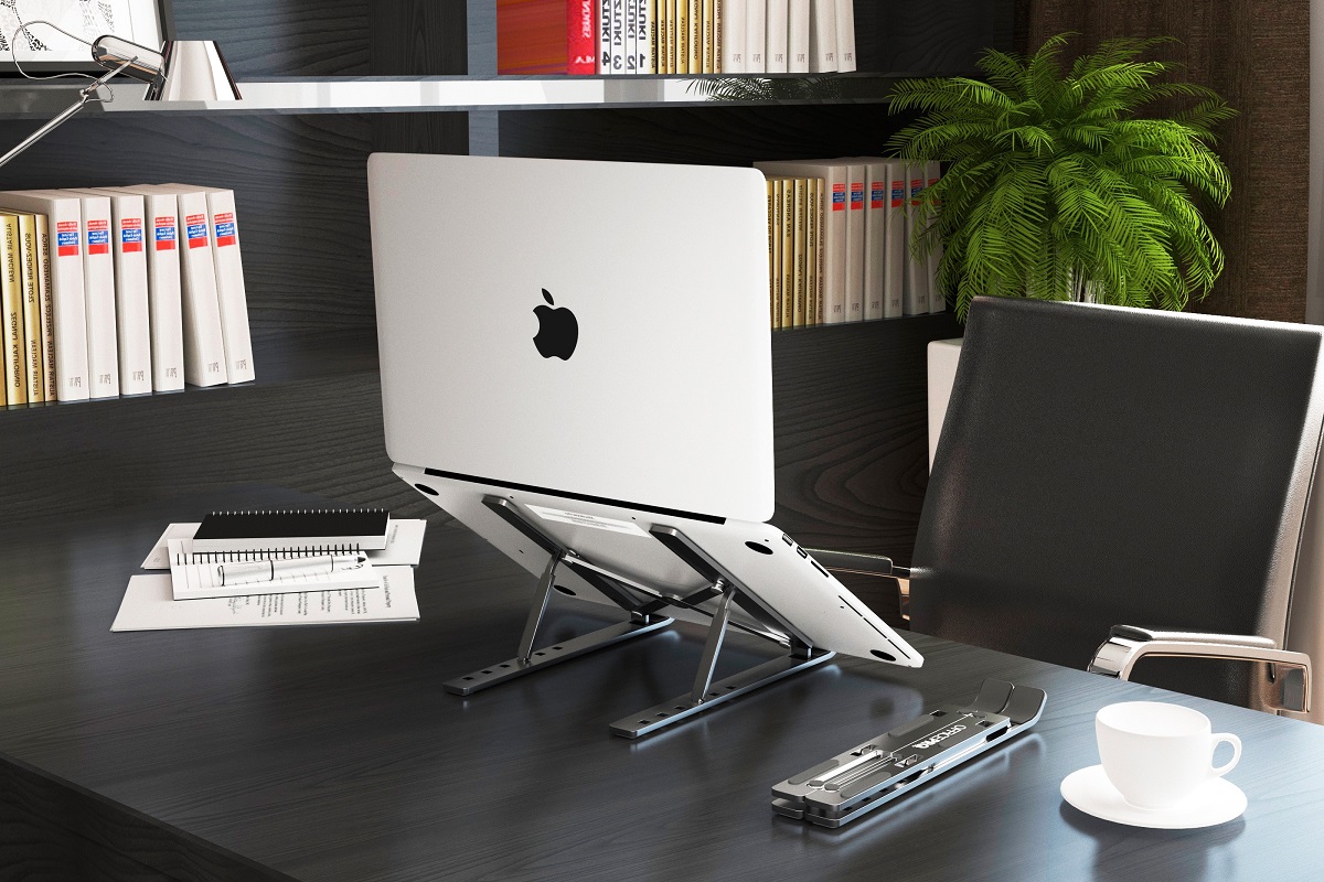 Прочная металлическая подставка раздвижного форм-фактора Durable Laptop Stand Fold годится для ноутбуков стандартного калибра — с экраном 15.6 дюймов.