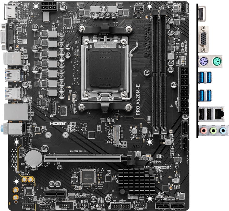 Материнская плата MSI PRO A620M-E на базе чипсета AMD A620 предлагает надежные решения для бесперебойной работы в составе домашнего или офисного ПК разного уровня. Схема питания включает 9 фаз и модуль оптимизации Core Boost, который обеспечивает точный контроль параметров тока для многоядерных маломощных процессоров серии 7000 / 8000 / 9000, построенных на сокете AM5. Реализована поддержка профилей EXPO для ОЗУ, а также безопасный разгон до 6800 МГц. Полноценный слот PCI-E 4.0 x16 позволяет устанавливать видеокарты для несложной обработки мультимедийных файлов, работы с графическими проектами, демонстрации презентаций в высоком разрешении и минимального гейминга. Он выделяется надежной конструкцией со стальной броней Steel Armor и защитой от статических разрядов. Стоит отметить, что плата довольно универсальная, но не подходит для длительных максимальных нагрузок, так как основной узел питания VRM не получил никаких модулей охлаждения. Производитель предусмотрел оптимальный набор разъемов для подключения современных и устаревших комплектующих, например, VGA-мониторов.