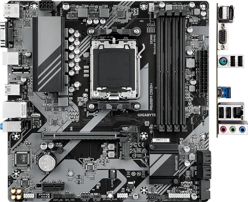 Материнская плата Gigabyte A620M DS3H позволяет проектировать домашние и офисные ПК с хорошей производительностью за счет надежных компонентов и интеллектуальных программных решений. Модель основана на системной логике A620, которая ориентирована на любительскую обработку видео, графические проекты, бухгалтерский софт и другие повседневные задачи, связанные с текстовой, финансовой или мультимедийной информацией. 9-фазная схема питания способна справиться с процессорами на сокете AM5 начального и среднего класса (Ryzen 3 / Ryzen 5 / Ryzen 7), обеспечить функциональность видеокарты уровня GeForce 3060 и 256 ГБ ОЗУ DDR5. Для последней реализована поддержка безопасного разгона с помощью профилей EXPO или XMP с максимальным показателем 8000 МГц. Основные узлы дополнены радиаторами охлаждения, которые исключают перегрев под нагрузками во время длительного рендеринга или гейминга на минималках.