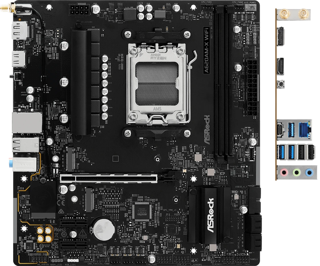 Материнская плата ASRock A620AM-X WiFi позволяет создать продвинутую рабочую станцию или домашний универсальный ПК с оптимальной производительностью. Качественные силовые узлы и надежная схема питания обеспечивает стабильное функционирование всех компонентов, а многослойная конструкция и дополнительное пассивное охлаждение гарантируют отсутствие перегрева при длительных нагрузках. Микросхема разработана на базе бюджетного чипсета AMD A620A с поддержкой интерфейса PCI-E 4.0 для видеокарты и M.2 накопителя, совместима с большинством процессоров Ryzen на сокете AM5, которым достаточно одной линии энергоснабжения 8 pin. Преимуществом модели является возможность использования наиболее быстрых планок ОЗУ, которые можно разогнать до 8000 МГц с помощью профилей EXPO или XMP.