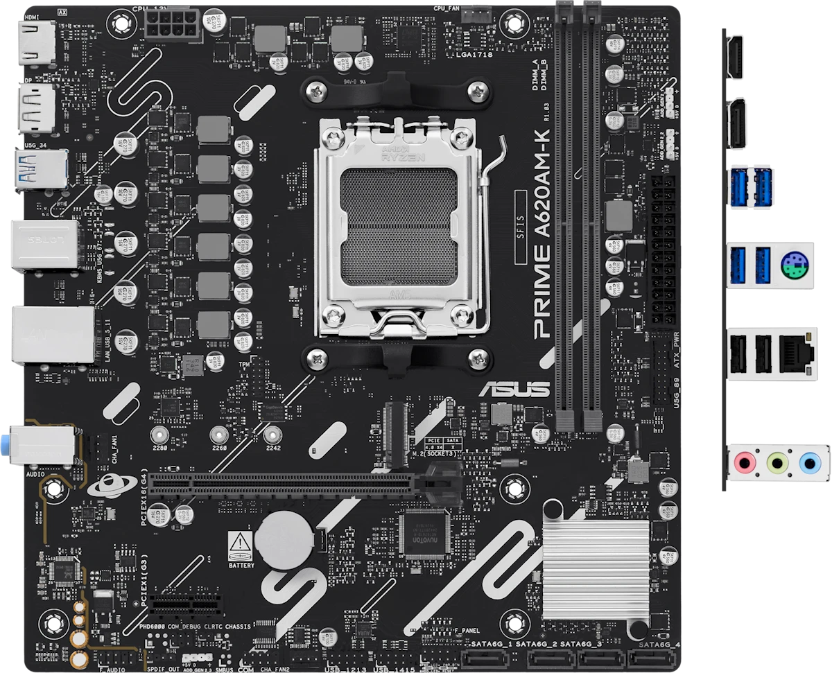 Материнская плата Asus PRIME A620AM-K выделяется хорошим соотношением бюджетной стоимости и качественной элементной базы, что гарантирует стабильную работу в течение многих лет в составе офисных и домашних ПК. Модель построена на базе чипсета A620A от AMD и получила полную совместимость с их процессорами AM5, мощность которых не превышает 120 Вт. Для ОЗУ предусмотрена двухканальная конфигурация, поддержка профилей EXPO с автоматическим разгоном до 7600 МГц и фирменное решение AEMP для оптимизации параметров любых планок памяти. Схема питания 6+2+1 (9 фаз) в сочетании с модулем стабилизации Digi+ гарантирует стабильное энергоснабжение всех компонентов. В микросхеме используются качественные MOP-транзисторы и твердотельные конденсаторы, которые имеют увеличенный срок службы и повышенную максимальную температуру эксплуатации. Однако продолжительными стрессовыми нагрузками материнку лучше не подвергать, так как зона VRM не оснащена элементами пассивного охлаждения.