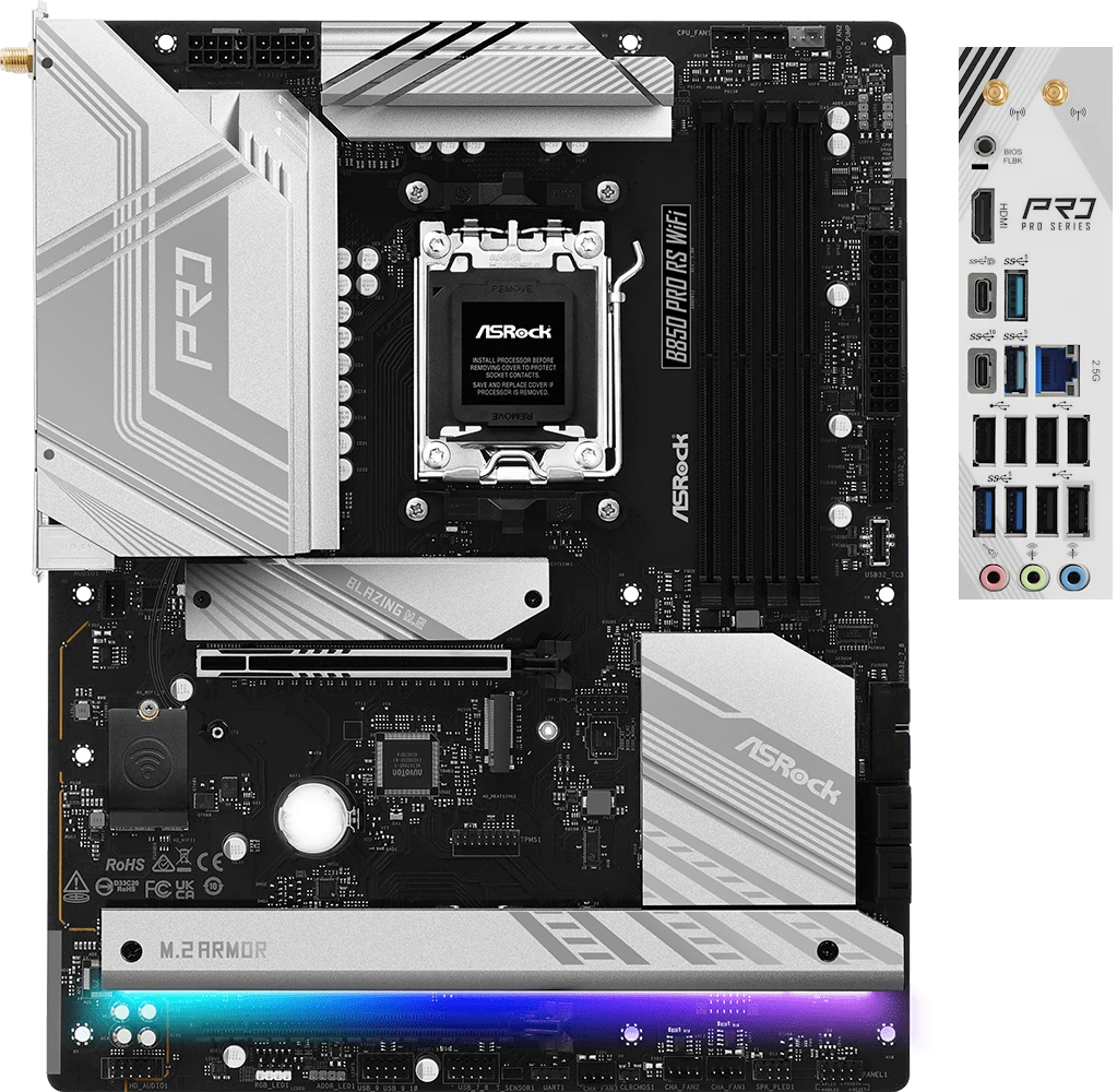 Материнская плата ASRock B850 Pro RS WiFi относится к серии Race Sport и выделяется соответствующим стильным дизайном. Черный текстолит хорошо сочетается с белыми радиаторами, геометрическими рисунками и логотипами, демонстрируя премиальное качество и игровую ориентацию. Более того, массивные алюминиевые блоки на всех основных узлах (чипсет, VRM, слоты M.2) эффективно рассеивают тепло, предотвращают троттлинг и выход из строя радиоэлектронных компонентов. Стоит отметить, что в плату уже интегрирована подсветка с поддержкой эффектов ASRock Polychrome Sync, которую можно синхронизировать через фирменную утилиту или BIOS.