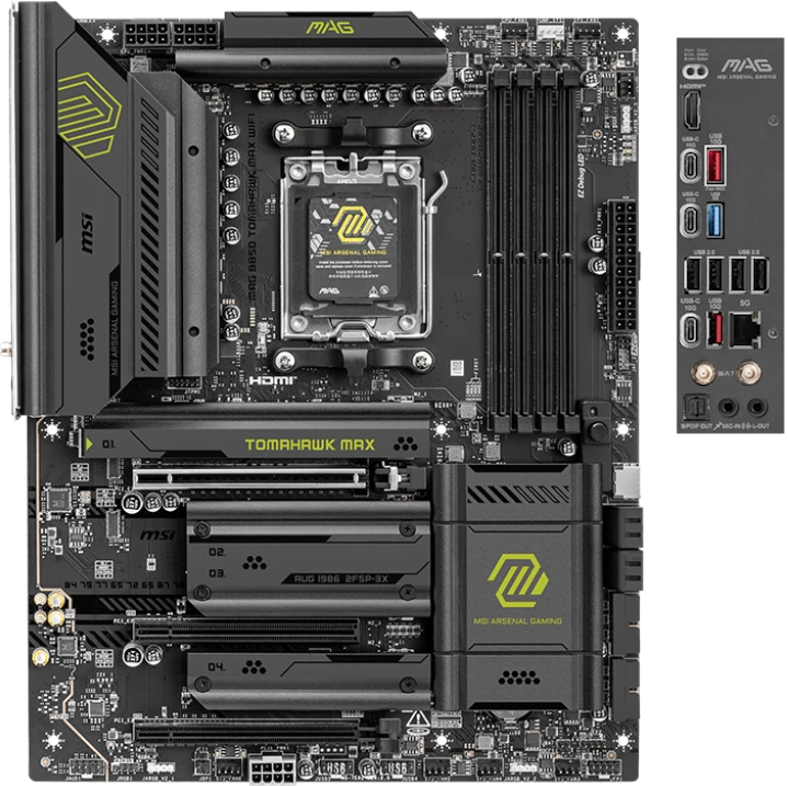 Материнская плата MSI MAG B850 TOMAHAWK MAX WIFI выделяется хорошим балансом цена / качество / функциональность и является эффективной базой для сборки высокопроизводительного ПК с минимальными затратами. Схемотехника модели предусматривает качественные электронные компоненты, которые выдерживают критические температуры и постоянную нагрузку. Распределение питания происходит с помощью 17-фазного конвертера с технологией Boost Core, который выдает стабильное напряжение и предотвращает повреждение основных узлов: процессор, ОЗУ, видеокарта. Уязвимые к нагреву места закрыты массивными радиаторами Shield Frozr. Также стоит отметить ряд современных интерфейсов для взаимодействия с пользователем и оборудованием. Среди основных можно выделить встроенные модули Wi-Fi 7 и Bluetooth 5.4, а также проводной порт LAN 5 Гбит/с. Они характеризуются высокой скоростью передачи данных и стабильным соединением без обрывов и помех. На задней панели нашлось место для трех разъемов USB-C 10 Гбит/с. Конструктивно модель выполнена по концепции EZ DIY, что позволяет проводить сборку без инструментов и облегчает обслуживание.
