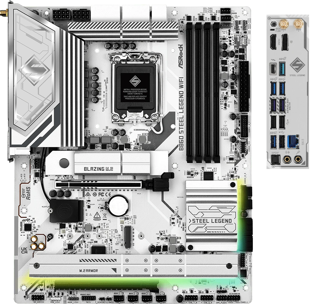 Материнская плата ASRock B860 Steel Legend WiFi отлично подойдет для реализации концепции «белой сборки». Премиальный внешний вид хорошо сочетается со встроенной подсветкой ASRock Polychrome Sync, массивными радиаторами для охлаждения зоны VRM, чипсета, накопителей M.2 и системой Lite Release для облегчения процесса сборки. Модель может похвастаться предустановленными беспроводными стандартами Wi-Fi 6E и Bluetooth 5.3, что не только избавит рабочую зону от лишних проводов, но и гарантирует высокую скорость обмена данными, более стабильную взаимосвязь с гаджетами. Важным дополнением стал разъем USB4, в котором реализована поддержка интерфейса Thunderbolt 4. Это позволяет увеличить пропускную способность до 40 Гбит/с, использовать порт для подключения больших экранов с разрешением 4K / 8K и совместимой игровой периферии. Техническое оснащение платы также предусматривает качественный звук от Nahimic независимо от источника сигнала, интеграцию в корпоративную или домашнюю сеть через LAN 2.5 Гбит/с и широкий простор для визуальной кастомизации лентами ARGB.