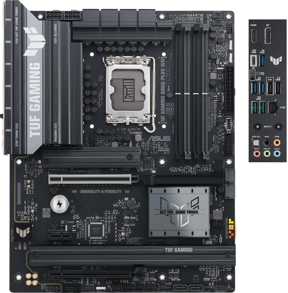 Материнская плата Asus TUF GAMING B860-PLUS WIFI сочетает в себе классический и легко узнаваемый дизайн игровой серии TUF с инновационными программно-техническими разработками, которые начали массово внедряться в начале 2025 года. Компания использует переработанную логику B860 от Intel с поддержкой интерфейса PCI-E 5.0, что гарантирует совместимость с топовым оборудованием для сборки производительных игровых и рабочих станций. Плата оснащена нейронным чипом (NPU), который пригодится для повышения эффективности взаимодействия с программами, использующими активно развивающиеся алгоритмы ИИ. Несомненным плюсом для пользователей является внедрение в структуру платы высокоскоростного Wi-Fi 7 с технологией агрегации диапазонов, а также стабильного и энергоэффективного беспроводного протокола Bluetooth 5.4. Плата изготовлена в формате ATX с хорошим комплектом разъемов для подключения устройств и обмена данными, включая USB-C с пропускной способностью 20 Гбит/с и возможностью вывода изображения на монитор / телевизор в разрешении до 8K. Для фанатов визуальных эффектов предусмотрена подсветка Asus Aura Sync, а меломаны оценят звук формата DTS и большое количество аудионастроек.