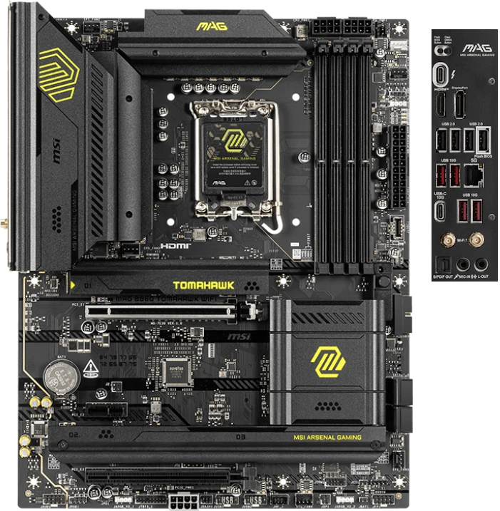 Материнская плата MSI MAG B860 TOMAHAWK WIFI предоставляет хороший набор возможностей для сборки эффективных геймерских станций при ограниченном бюджете. Взаимодействие между комплектующими обеспечивает набор инструкций B860 от Intel, который пришел в 2025 году на замену B660. Главными особенностями модели является комплексная поддержка PCI-E 5.0, ОЗУ с частотой до 9200 МГц в бусте, интеллектуальных процессоров Core Ultra (Series 2) и наиболее свежих беспроводных стандартов Wi-Fi 7 (ширина канала 320 МГц, 3 диапазона) и Bluetooth 5.4. Разъем USB-C с интерфейсом Thunderbolt 4 расширяет перечень совместимых устройств и делает их подключение максимально простым. Среди прочего присутствует проводной LAN на 5 Гбит/с, поэтому в целом оборудование способствует быстрому обмену данными, подключению высокоскоростного интернета и стабильному минимальному пингу во время онлайн-развлечений. Компания предусмотрела внушительный арсенал дополнительного ПО для детальной настройки сети, звука и прочих направлений, а обновленный БИОС с ИИ-алгоритмами позволяет адаптировать всю систему под текущие задачи в пару кликов.
