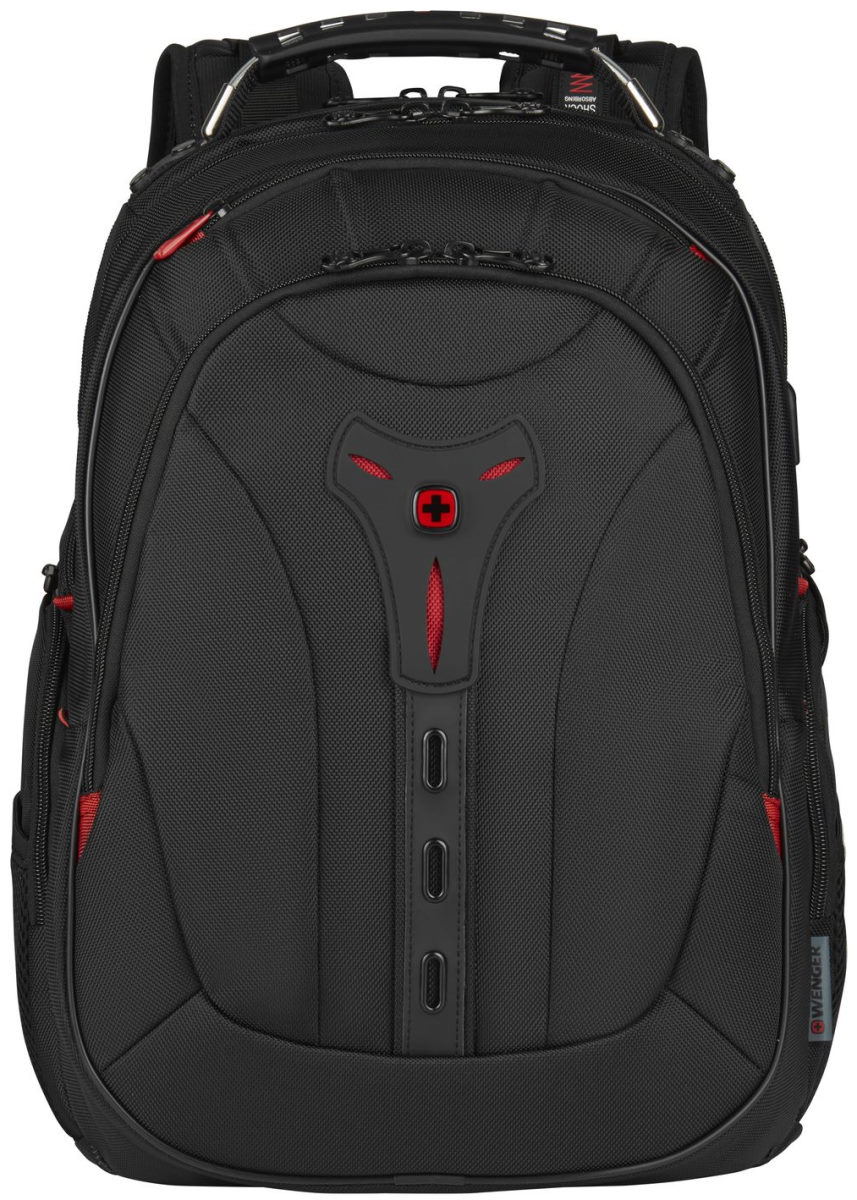 Рюкзак Wenger Pegasus Deluxe 16 выделяется продвинутыми решениями для повышения комфорта передвижения с максимальной загрузкой. Производитель уделил особое внимание конструкции спинки. Она получила анатомические свойства, поясничную поддержку и систему вентиляции AirFlow в виде абсорбирующих мягких подушек. Эргономичные плечевые лямки с технологией AntiShock позволяют минимизировать дискомфорт при активном движении (быстрая ходьба, бег, прыжки), поэтому модель актуальна не только для городских прогулок, но и похода на природу, путешествий. Рюкзак быстро крепится на ручку чемодана лямкой Premium Pass-Thru и гарантирует устойчивое вертикальное положение на полу благодаря усиленному дну CaseBase. Выгодным преимуществом является защита от воды, которая усилена у основания, что убережет вещи при размещении на мокром полу. Также к важным особенностям относится встроенный USB-разъем SmartCharge с внешней стороны для зарядки смартфона от повербанка (приобретается отдельно) во время движения. Среди прочего можно отметить необычный внешний вид и далеко не бюджетную стоимость.