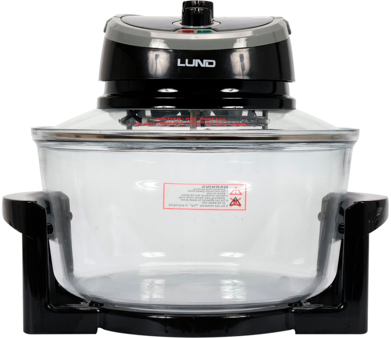 В оснащение аэрогриля входит большая чаша из закаленного стекла объемом 12 литров, в которой можно расстаивать тесто, запекать целую рыбу или курицу, а также готовить на нескольких уровнях одновременно. Если же этого объема мало — специальное кольцо позволяет увеличить емкость чаши до 17 литров без необходимости покупать новую технику с большей посудой.