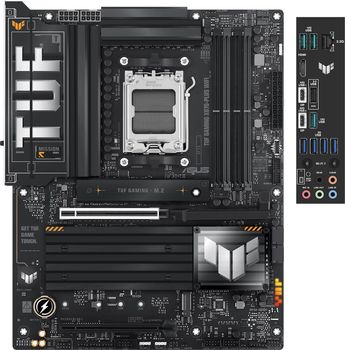 Материнская плата Asus TUF GAMING X870-PLUS WIFI предлагает надежную платформу для создания современной игровой станции, производительного рабочего ПК для графических проектов с 3D моделированием, медиасервера и прочих ресурсоемких систем. Компания взяла за основу флагманский чипсет X870 от AMD с поддержкой PCI-E 5.0 для видеокарты и M.2 накопителей, а также других полезных технологий. На борту USB4 с альтернативным видеорежимом, коннектор для корпусного USB-C с Power Delivery, наиболее быстрые на начало 2026 года спецификации Wi-Fi 7 и Bluetooth 5.4, Это говорит о полной совместимости со всеми игровыми гаджетами, включая продвинутые VR-системы, и большой скорости взаимодействия / передачи данных. Производитель обеспечил простоту оптимизации параметров с помощью интеллектуальной прошивки ASUS AI Solutions для БИОС, удобные механизмы бесключевой сборки, тестирования, отладки. Материнская плата ориентирована как на продвинутых киберспортсменов, так и начинающих геймеров. Она предоставляет объемный и чистый звук формата DTS, дополнительные игровые функции для получения преимуществ во время боя, свободу кастомизации с применением ARGB.