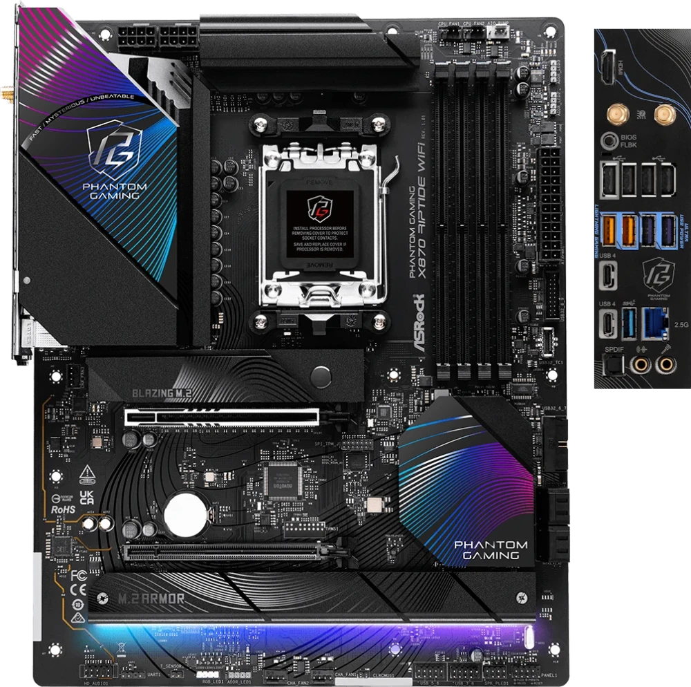 Системная логика флагманского класса X870 предполагает значительный прирост быстродействия за счет полной поддержки интерфейса PCI-E 5.0 и различных современных технологий, появившихся на рынке в 2025 году. Модули ОЗУ стандарта DDR5 можно разгонять до 8000 МГц с помощью безопасных профилей XMP / EXPO, а повысить вычислительную мощность графической системы поможет механизм объединения нескольких видеокарт CrossFire. Возможности модулей связи также максимальные для данного чипсета. Присутствует высокоскоростной Wi-Fi 7 и Bluetooth 5.4, проводная сеть представлена контроллером Killer E3100G с пропускной способностью 2.5 Гбит/с. Показателей хватит для безлимитного онлайн гейминга, общения, просмотра цифрового контента в высоком разрешении и эффективного обмена данными в локальной сети. Полезным дополнением стали USB4 40 Гбит/с и специальные USB-A порты Lightning для эффективного взаимодействия с игровыми устройствами управления.