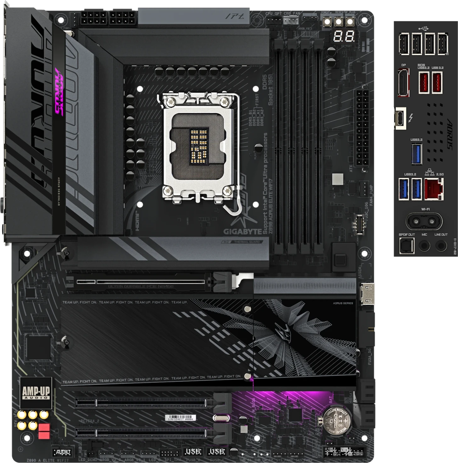 Модель совместима со всей возможной периферией благодаря грамотному подходу к техническому оснащению. Здесь присутствуют Thunderbolt 4, USB4, стандартные и альтернативные варианты вывода видеосигнала, коннекторы для корпусных разъемов USB-C, светодиодных лент, умных вентиляторов. Материнская плата обеспечивает совместимость с игровыми девайсами, графическими планшетами для творчества и разработки, системами виртуальной реальности и 3D печати. Предельная скорость трафика для онлайн сражений со стримом и просмотра контента в 4K / 8K формируется за счет беспроводного модуля связи Wi-Fi 7 и проводного порта LAN 2.5 Гбит/с. Среди прочего можно отметить интересный дизайн как самого текстолита, так и радиаторов охлаждения. Производитель добавил элементы подсветки и возможность синхронизации эффектов по технологии Gigabyte RGB Fusion. Установка всех компонентов осуществляется без использования инструмента, что предполагает быструю замену. Для тестирования и отладки реализован комплекс функциональных кнопок и POST кодер.
