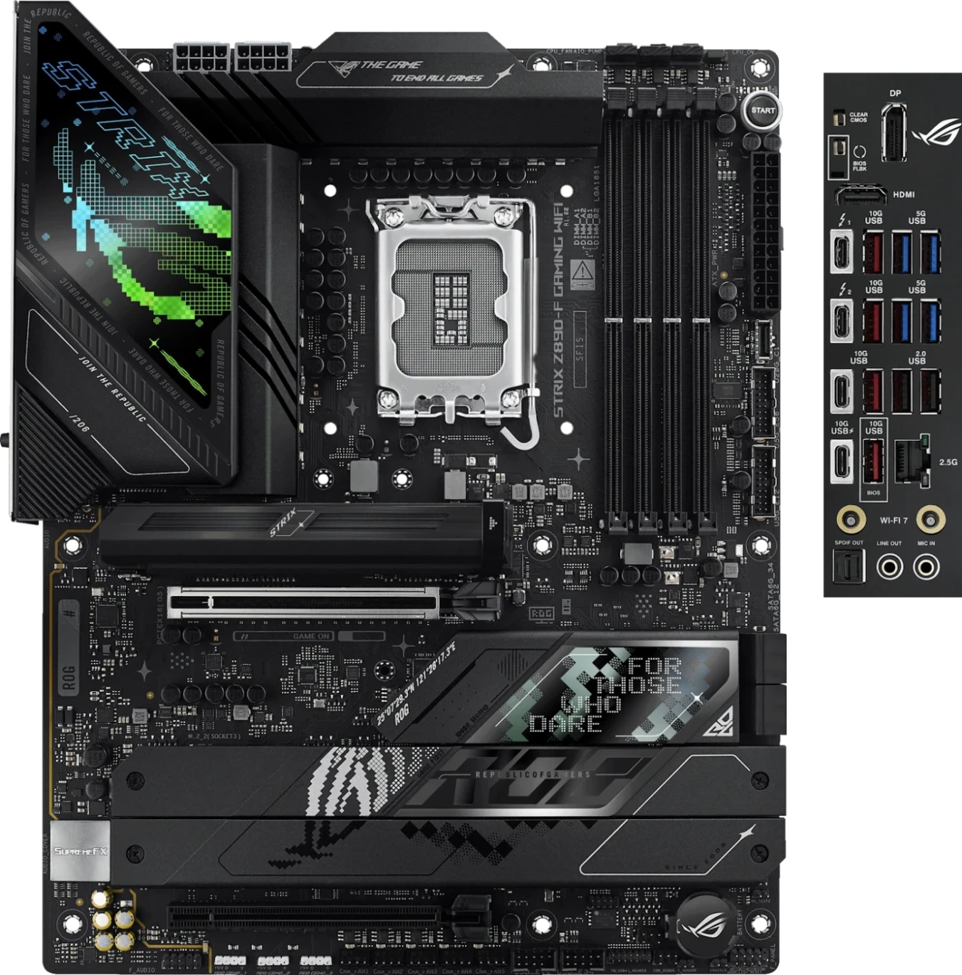 Материнская плата Asus ROG STRIX Z890-F GAMING WIFI сосредоточила внимание на передовых технологиях, поэтому позволяет создать профессиональный игровой ПК с максимальной поддержкой оверклокинга и интеллектуального контроля. Основой стал чипсет Z890 от Intel с набором инструкций для эффективного взаимодействия главных компонентов: ОЗУ, процессор, видеокарта. Реализована их полная совместимость со стандартом PCI-E 5.0, что стирает любые ограничения для пользователя в плане выбора. Важным фактором для долговечного и безопасного функционирования сборки является схема питания из 21 фазы. Она разделена на отдельные сегменты для энергоснабжения основных узлов и точного контроля параметров. Максимальная сила тока для процессора достигает 110 А, что предполагает свободный разгон современных чипов Core Ultra 200S. Линия питания оперативной памяти способна справится с экстремальной частотой 9066 МГц. Компания продолжает заботится о качестве и надежности всех радиоэлектронных деталей, проводя тщательное тестирование по военным стандартам. Стоит отметить обновленный БИОС и софт, в которых ведущую роль играют алгоритмы ИИ для стабилизации энергетической и тепловой нагрузки, а также улучшения работы вторичных систем — сеть, звук, микрофон, интерфейсы.