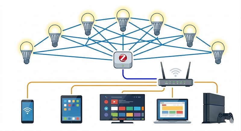 Более продвинутый вариант — Zigbee. В этом случае лампы подключаются не напрямую к Wi-Fi, а через специальный хаб (шлюз), благодаря чему система работает стабильнее, быстрее реагирует на команды и меньше нагружает домашнюю сеть. Ключевое преимущество Zigbee — Mesh-архитектура: каждая лампа усиливает сигнал для соседних, а сама сеть работает локально и не зависит от «облака» производителя. Именно поэтому Zigbee часто используют в крупных системах умного дома.