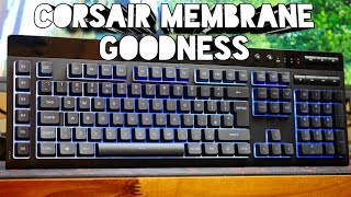 Полноразмерная брендовая геймерская клавиатура стандарта ANSI с мембранными переключателями, высоким ходом клавиш, влагозащитой, встроенной памятью для макросов, настраиваемой фирменной 5-и зонной RGB LED-подсветкой Corsair iCUE. Оборудована 110 клавишами, в т.ч. полноценным цифровым блоком, малой клавишей Enter, широкими клавишами Shift и длинной клавишей Backspace. Корпус типа Skeleton обеспечивает простой и быстрый доступ к переключателям, за счет чего клавиши можно с легкостью снимать и ставить на место для очистки от пыли/грязи.