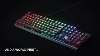 Полноразмерная игровая клавиатура с надежными гибридными механико-мембранными переключателями, собственным OLED-дисплеем, сверхпрочным алюминиевым корпусом типа Skeleton, магнитной подставкой для запястий, многоцветной управляемой LED-подсветкой, встроенной памятью и функцией подавления фантомных срабатываний при одновременном нажатии сложных многоклавишных комбинаций (до 24 кнопок, расположенных в текстовой зоне клавиатуры).